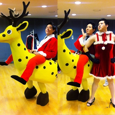 Boom is seen riding a yellow reindeer in what looks to be a practice room. Standing beside him with his arms at his hips, Mrs. Claus Shindong looks like he’s ready to face all the Grinches in the world to ensure a happy Christmas.