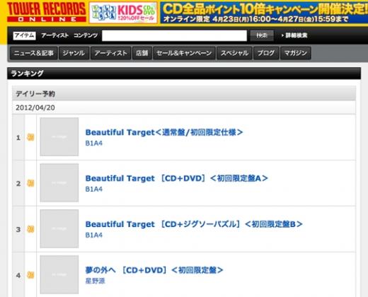 According to WM Entertainment, B1A4′s first single, ‘Beautiful Target‘, ranked first on the combined daily pre-order chart of Japan’s biggest record store, Tower Records. Not only that, but following in second and third are also A and B versions of the same album.