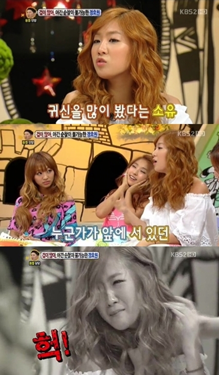 The show featured a security guard who explained that he had so many fears, it was hard for him to perform his duties at night. Soyu spoke on the issue and spooked everyone when she began by saying, “People that see ghosts have it harder.” She then relayed one instance in which she saw a ghost. “During my trainee days, I remember getting on an elevator with my friend. When the door opened, someone was standing there so I screamed, ‘Ah!’”